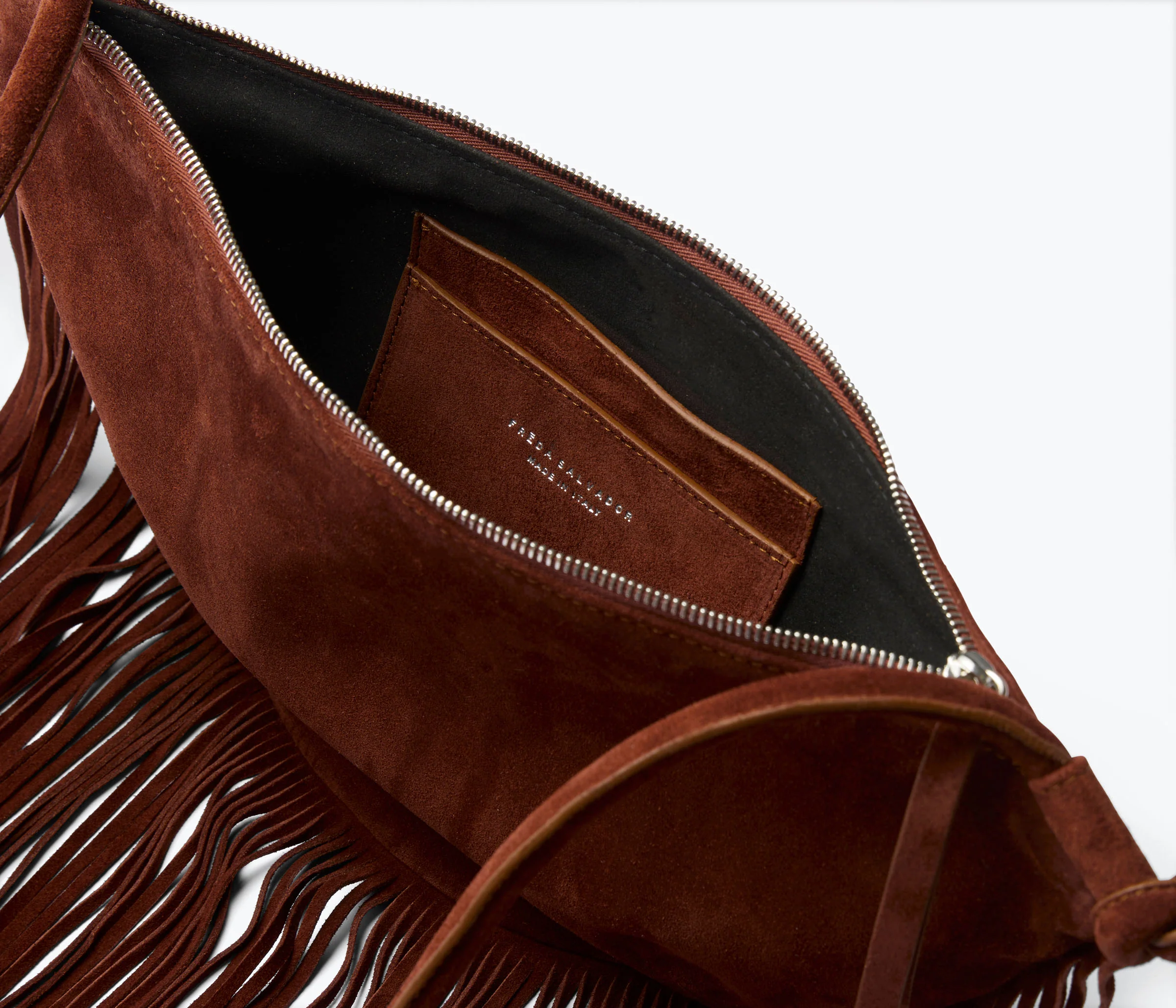 Boho dressing means fringe—a slouchy soft suede crescent handbag that is beautiful, multi-functional, and moves with you. Made by hand in Italy.