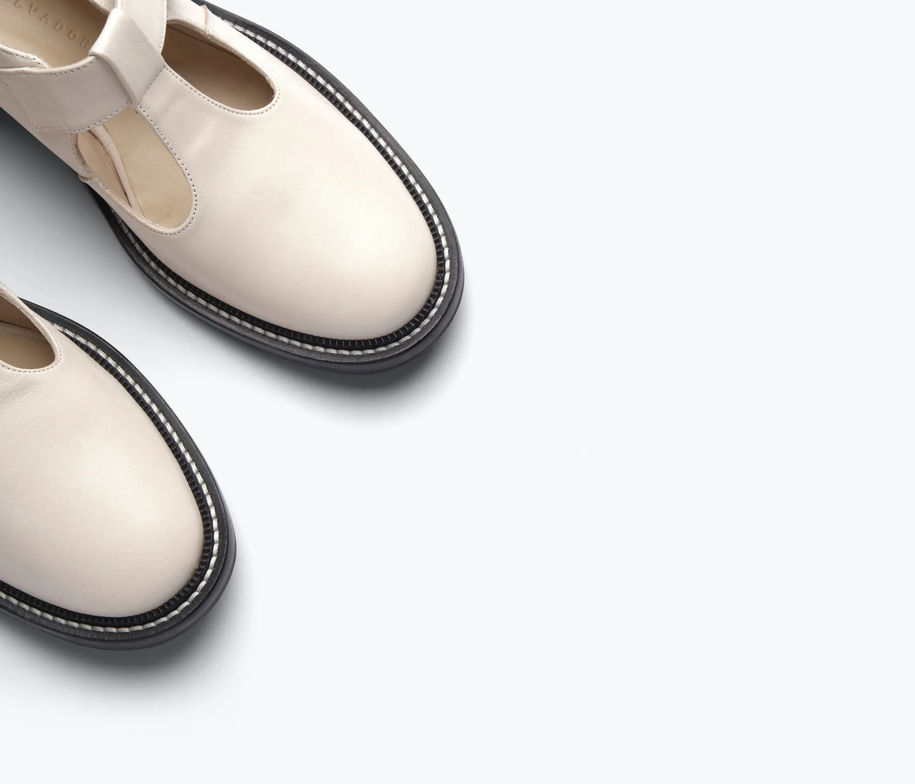 The essential mary jane loafer. Handcrafted in a powder white pebbled calf, the HELEN updates the classic style with cool hardware and our iconic notched leather welt. Good with or without socks, we love this style with a denim on denim look or everyday tailoring.
